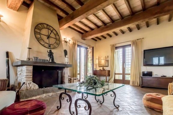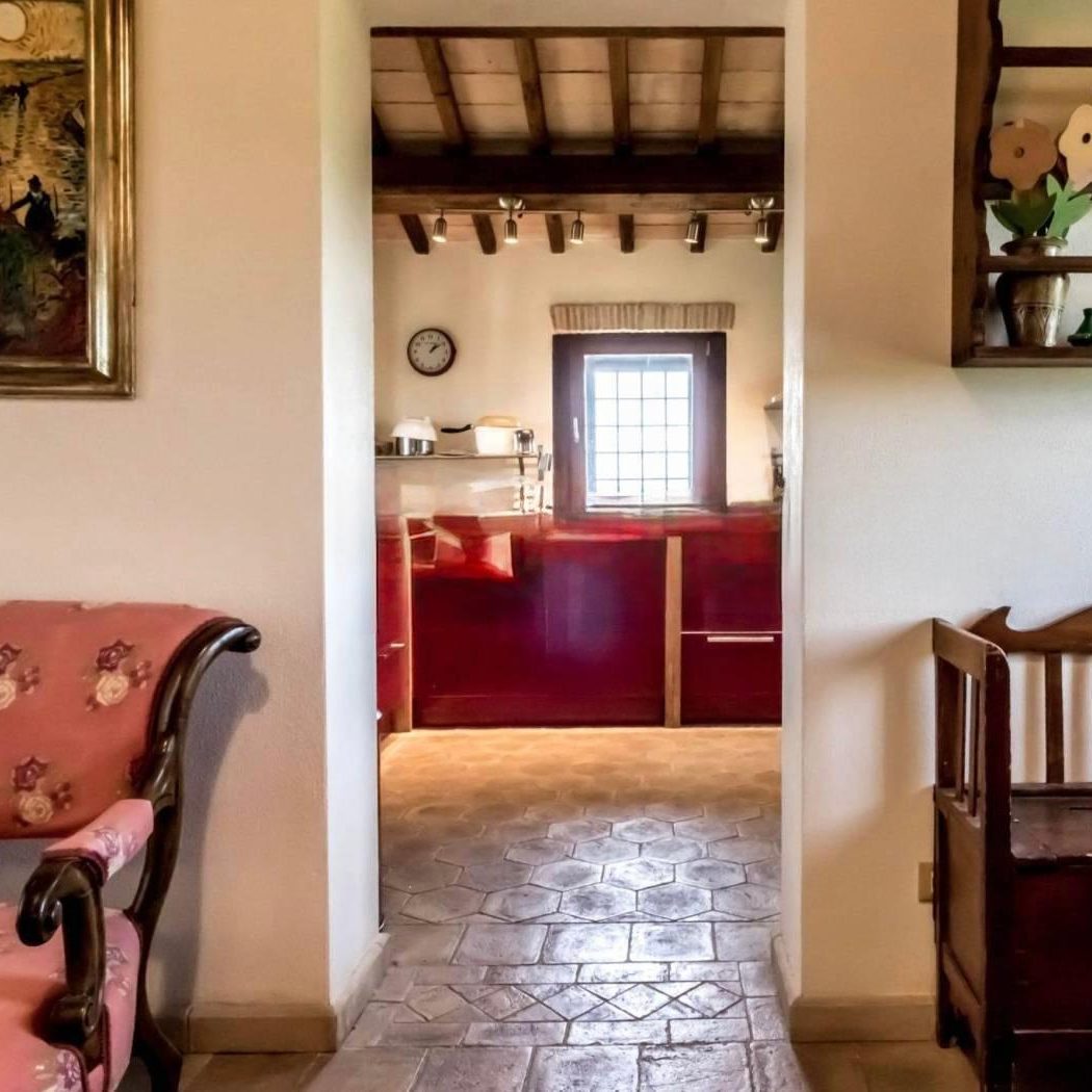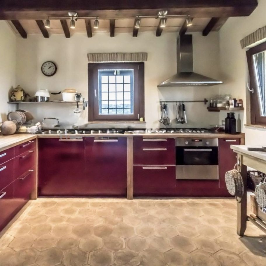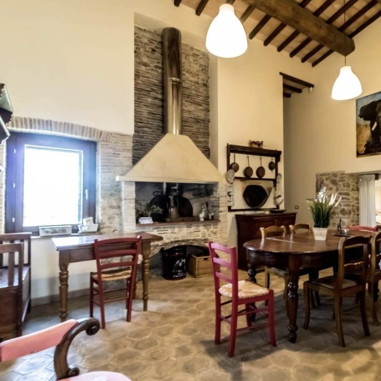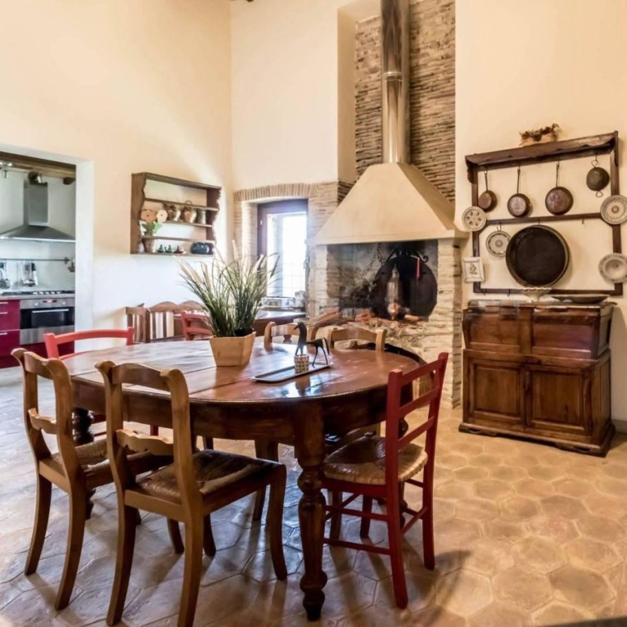 Al piano terra, il grandissimo salone cattura subito lo sguardo: travi a vista, muri in pietra e ampie aperture creano un ambiente luminoso e armonioso, perfetto per momenti di convivialità o per godere della quiete che solo una dimora di campagna sa regalare. Accanto, un bagno di servizio discreto e funzionale completa la zona giorno, mentre la sala da pranzo invita a ritrovarsi intorno al tavolo, tra comfort e atmosfera raccolta. La cucina panoramica, affacciata su tre lati, permette di cucinare ammirando il paesaggio circostante: un ponte perfetto tra vita interna ed esterna, tra storia e natura.